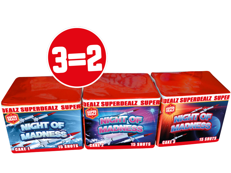 Night of Madness n n3 compacte cakes van 15 schoten in een box gestopt. Leuk om samen af te steken! n nKruitgewicht 165 Gram nTube diameter 20 nBrandtijd 30 Seconden nHoogte 20 m. – 25 m. n